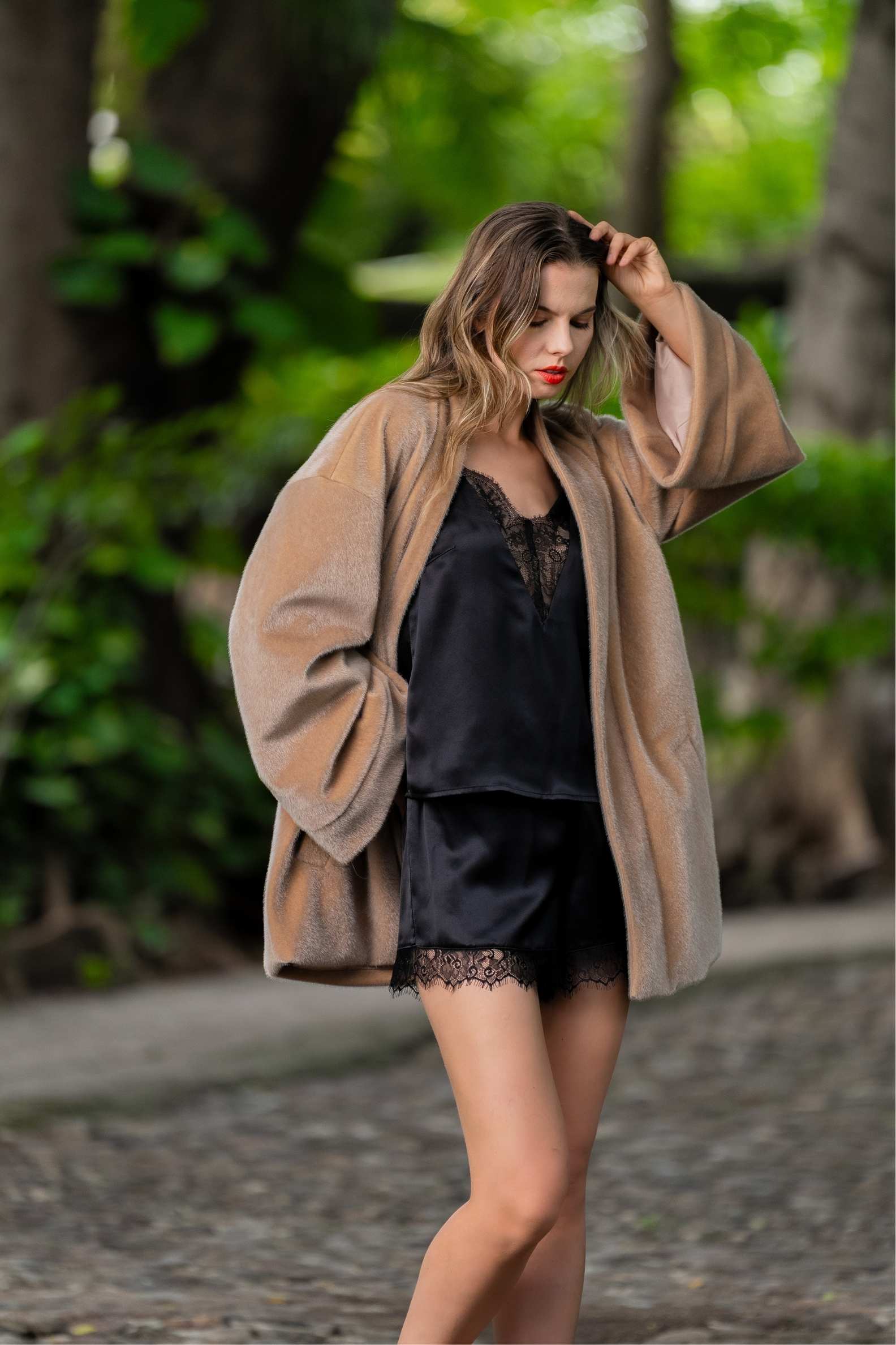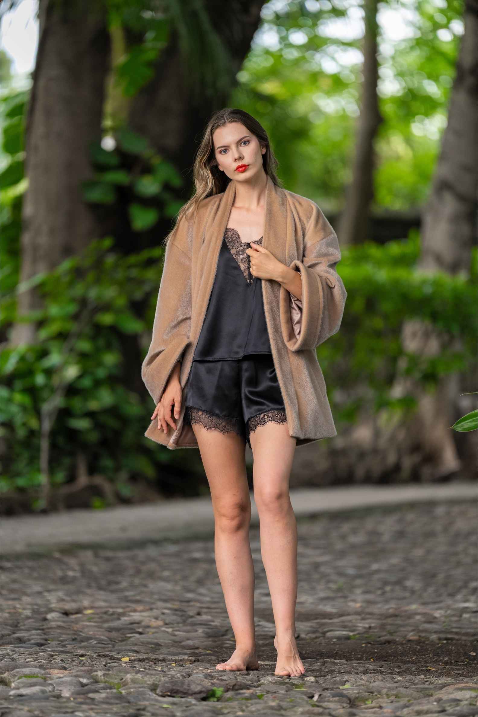 Inspirado en calidez serenidad. el Abrigo Premium Mink combina suavidad envolvente y ligereza atemporal. Su textura aterciopelada invita al tacto, recordando el confort íntimo del hogar con la distinción de una silueta amplia y fluida. Confeccionado materiales de alta calidad, su caída natural acompaña el movimiento con gracia, mientras el tono caqui aporta una elegancia silenciosa que trasciende estaciones.