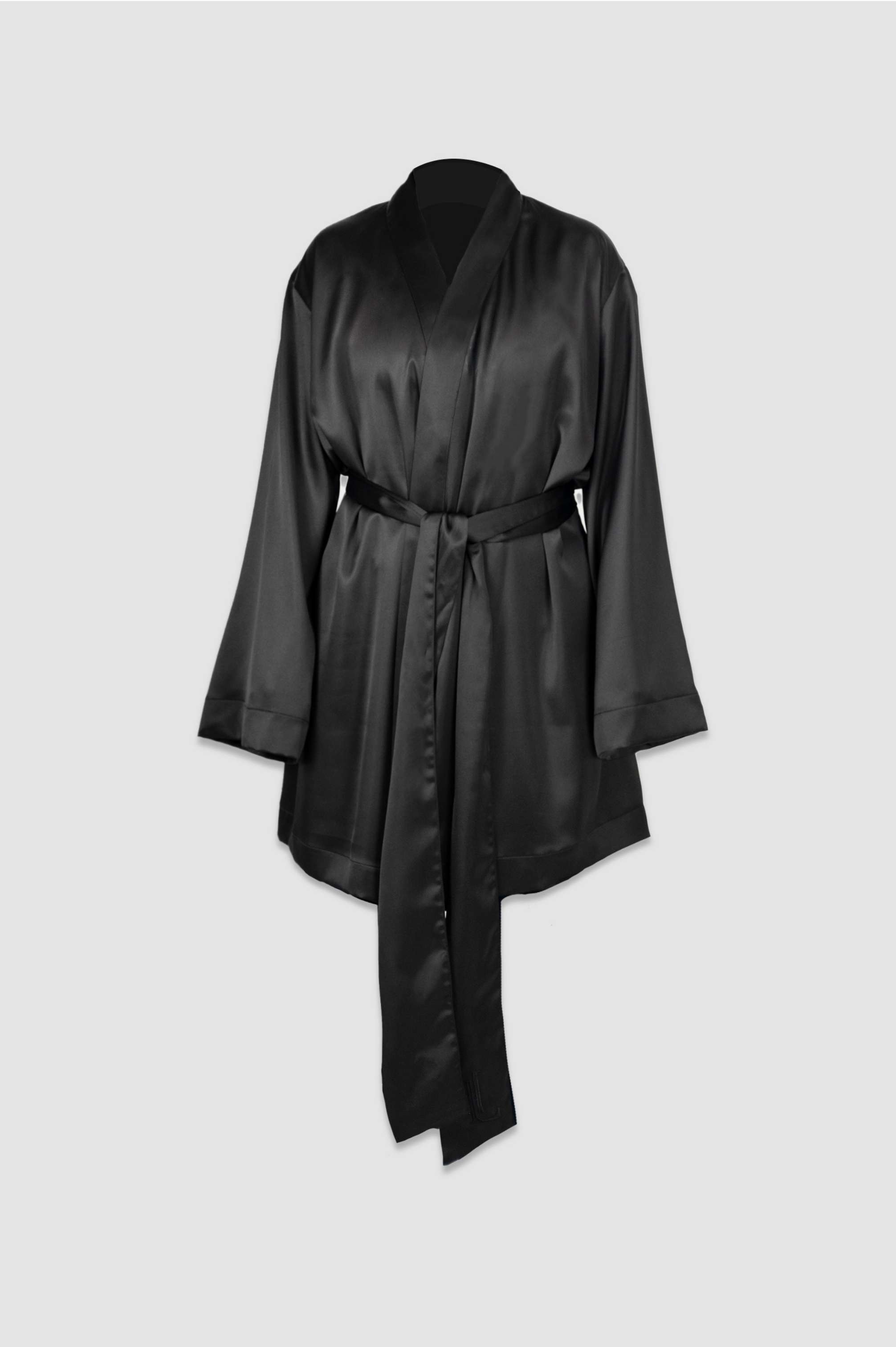 Confeccionada en charmeuse premium y adornada con cinta bordada, esta bata corta es una expresión de lujo funcional. Su silueta ligera y su caída impecable la convierten en una prenda ideal para quienes valoran la belleza también en los momentos cotidianos. Disponible en negro y ivory, su diseño combina lo clásico con un aire contemporáneo que transforma el descanso en un gesto de elegancia relajada.
