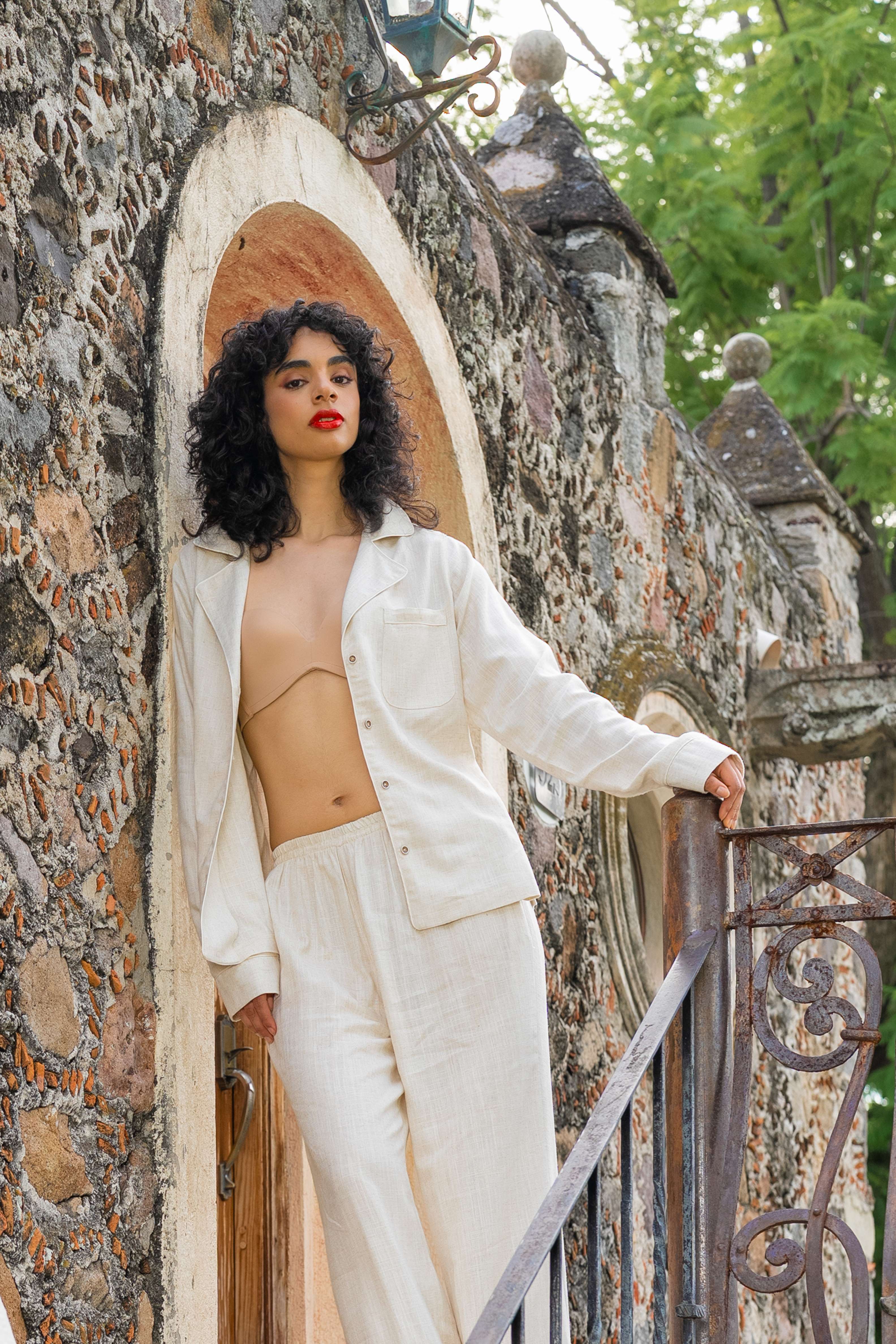Confeccionada en lino liso, esta pijama fusiona la textura natural de la fibra con un diseño atemporal y relajado. Su estructura ligera permite que la piel respire, brindando frescura durante todo el día. Es una prenda versátil y refinada, ideal para quienes encuentran belleza en lo simple y autenticidad en cada detalle.