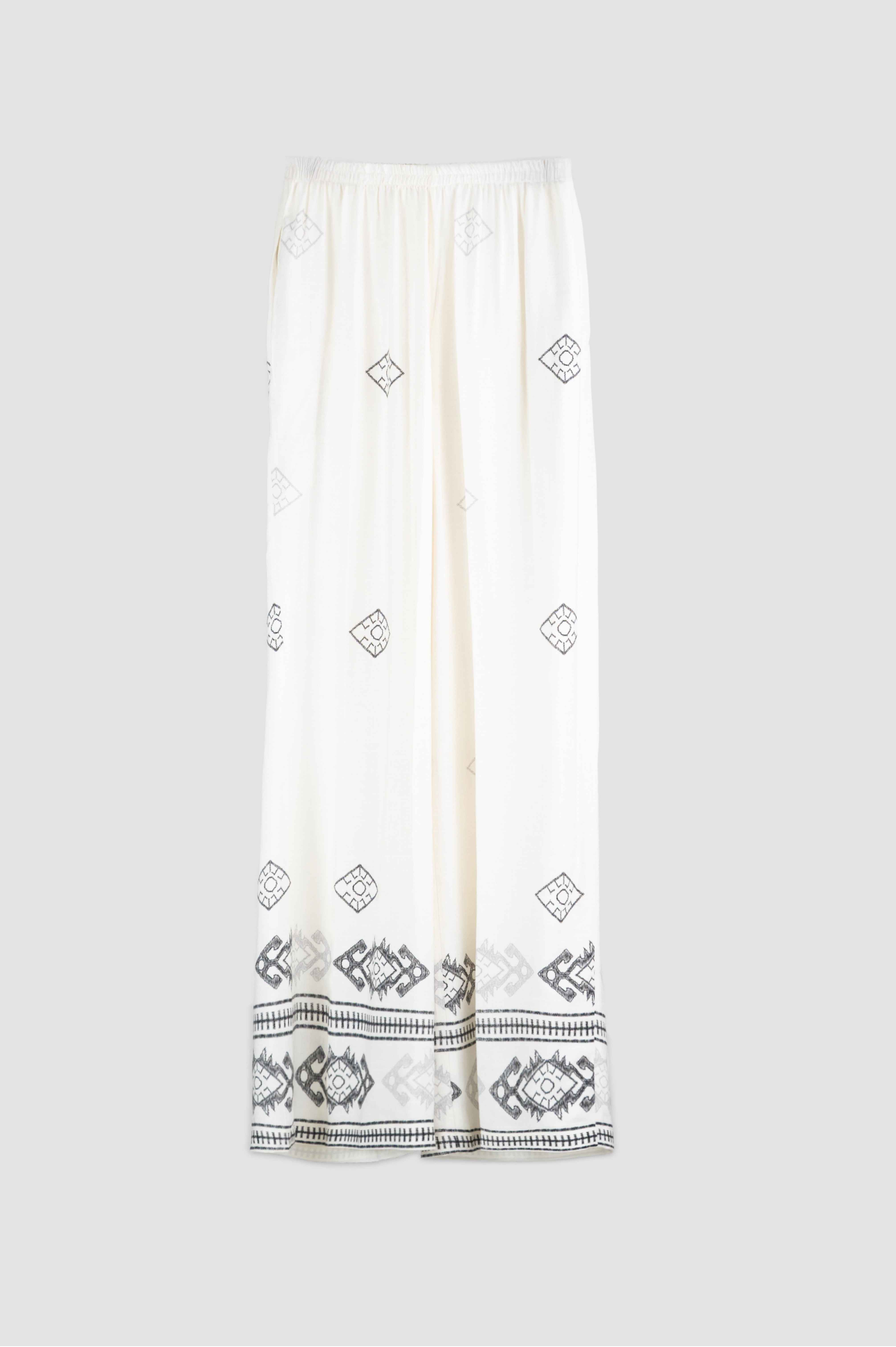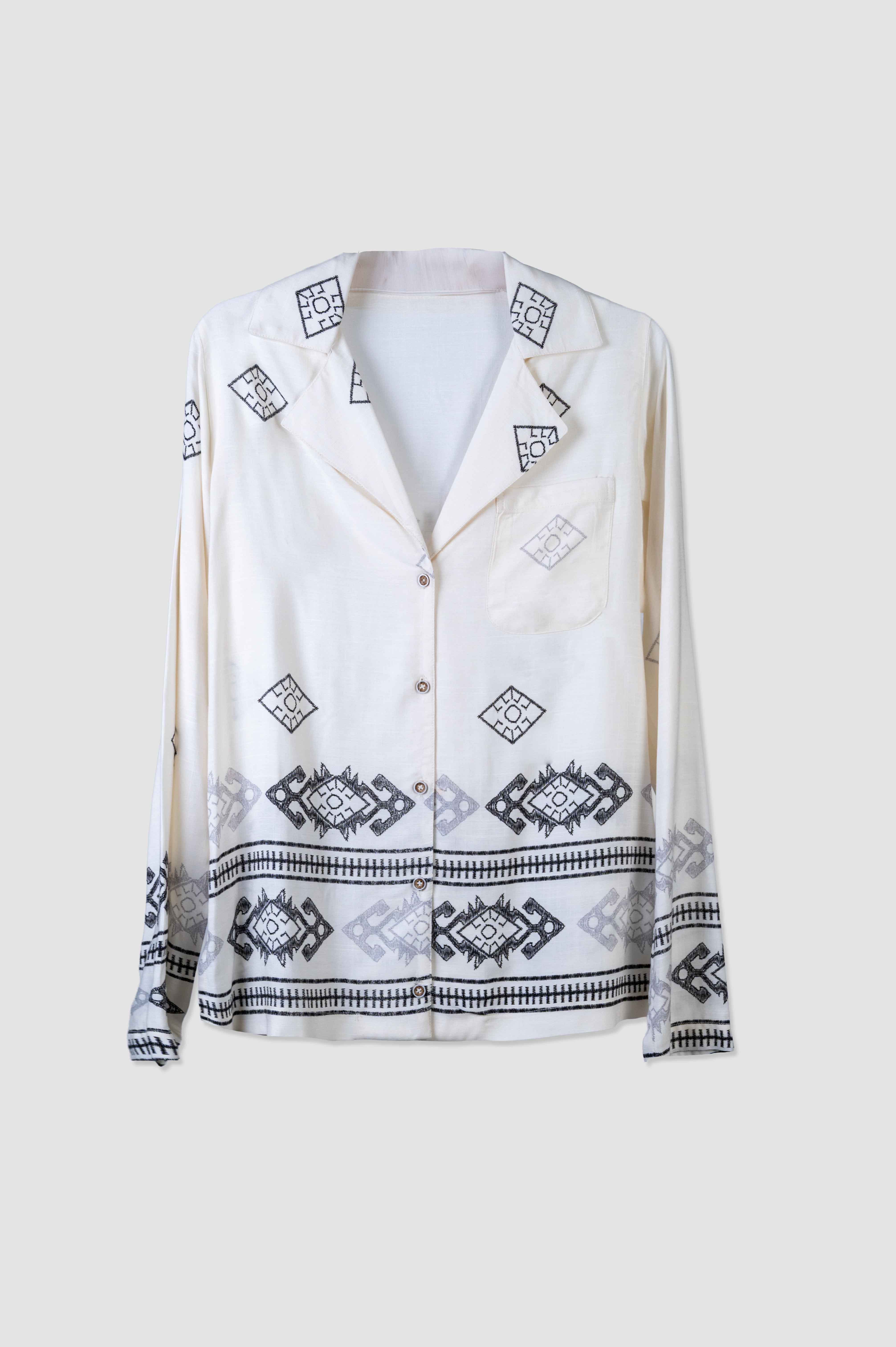Este conjunto de pijama en chalisse de viscosa destaca por su caída suave y su estampado artístico de inspiración étnica. Las líneas geométricas y los tonos contrastantes aportan un aire atemporal y expresivo, mientras que su tacto ligero invita a habitar el descanso con elegancia y personalidad. Una pieza pensada para mujeres que hacen de cada momento íntimo una extensión de su estilo.